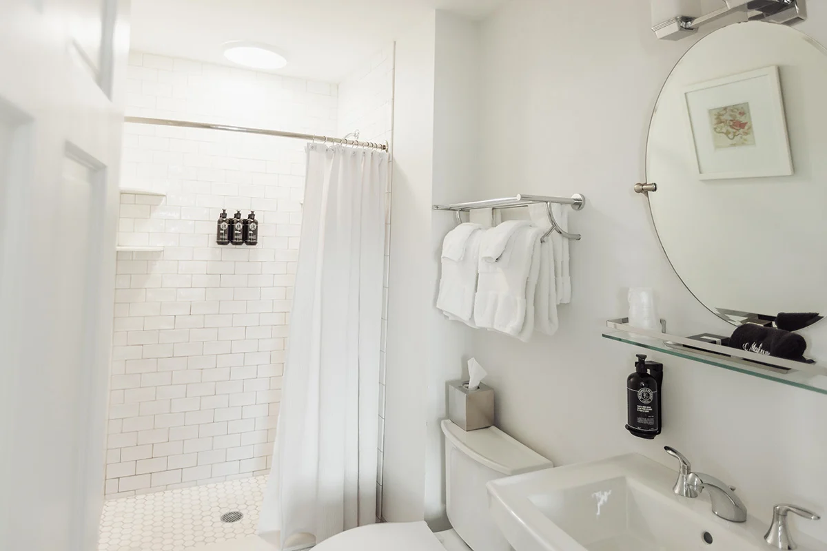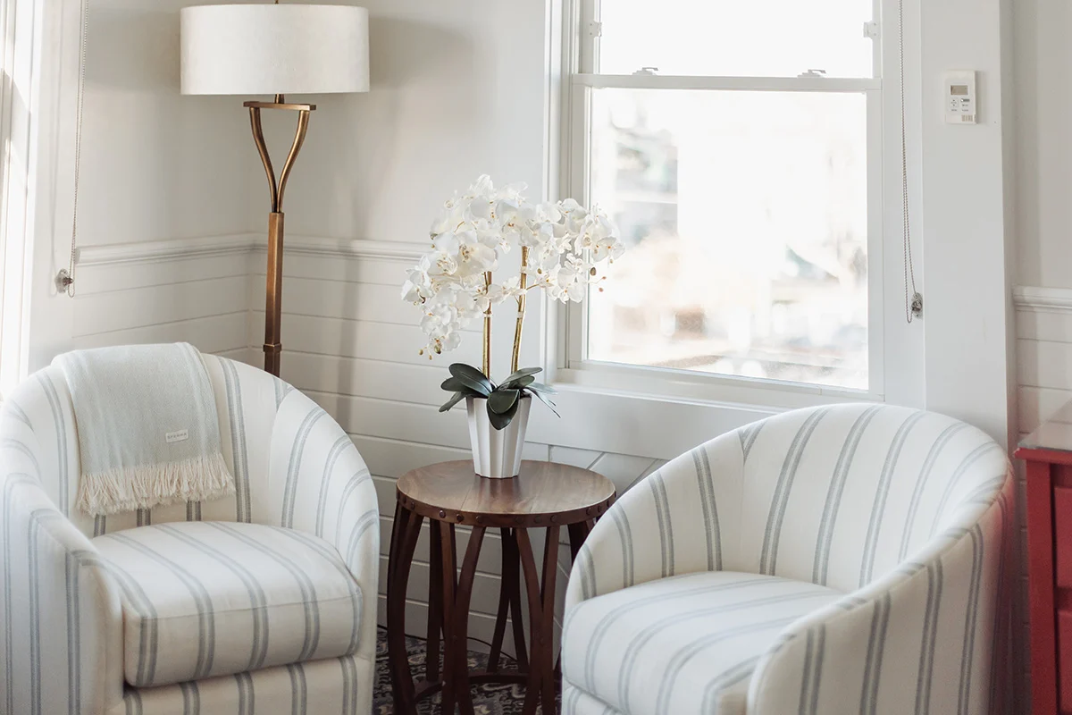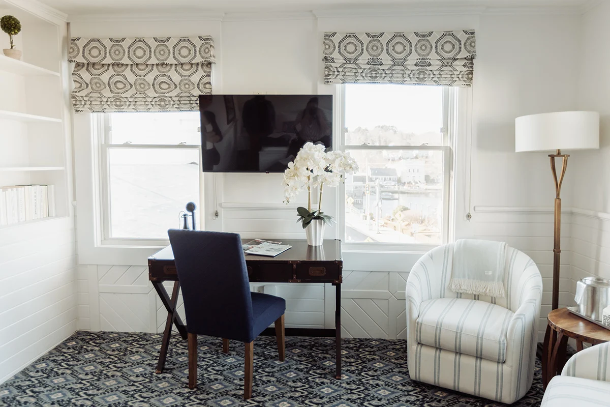 Up on the third floor of the 1920 Main Inn, this corner guestroom feels like a classic Mystic stay with a fresh, nautical touch. Windows look out over historic Main Street with partial glimpses of the Mystic River, giving you a little scenery to go with your morning coffee and a sense of place from the moment you arrive.