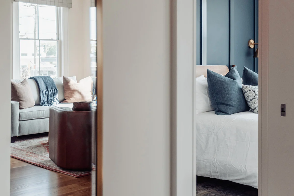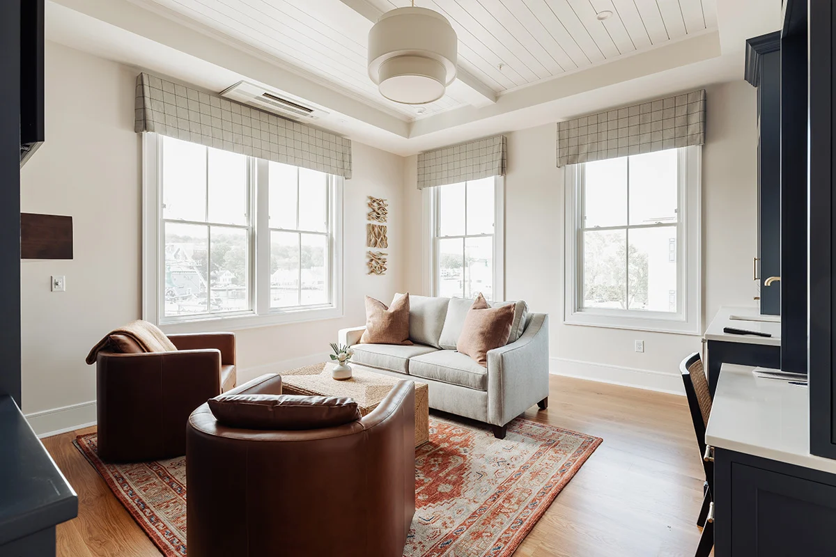 The Stanton Deluxe Suite in Stanton House is a generous two-bedroom retreat with a front-row feel of downtown Mystic. Set on the second and third floors of the newly renovated building, the suite pairs a king bedroom with river views alongside a second king bedroom, plus a separate living room and kitchen area that makes it easy to settle in and stay awhile.